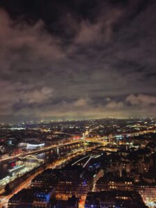 Since we had arrived at the Eiffel Tower shortly before 9 p.m., we waited a moment for the Eiffel Tower to light up. Once again, my exchange partner and I decided to take the stairs instead of the elevator. It was a bit exhausting, but it could have been worse. Once at the top, we met up with my host parents again. Before going down again, we were enjoying the view for a while.