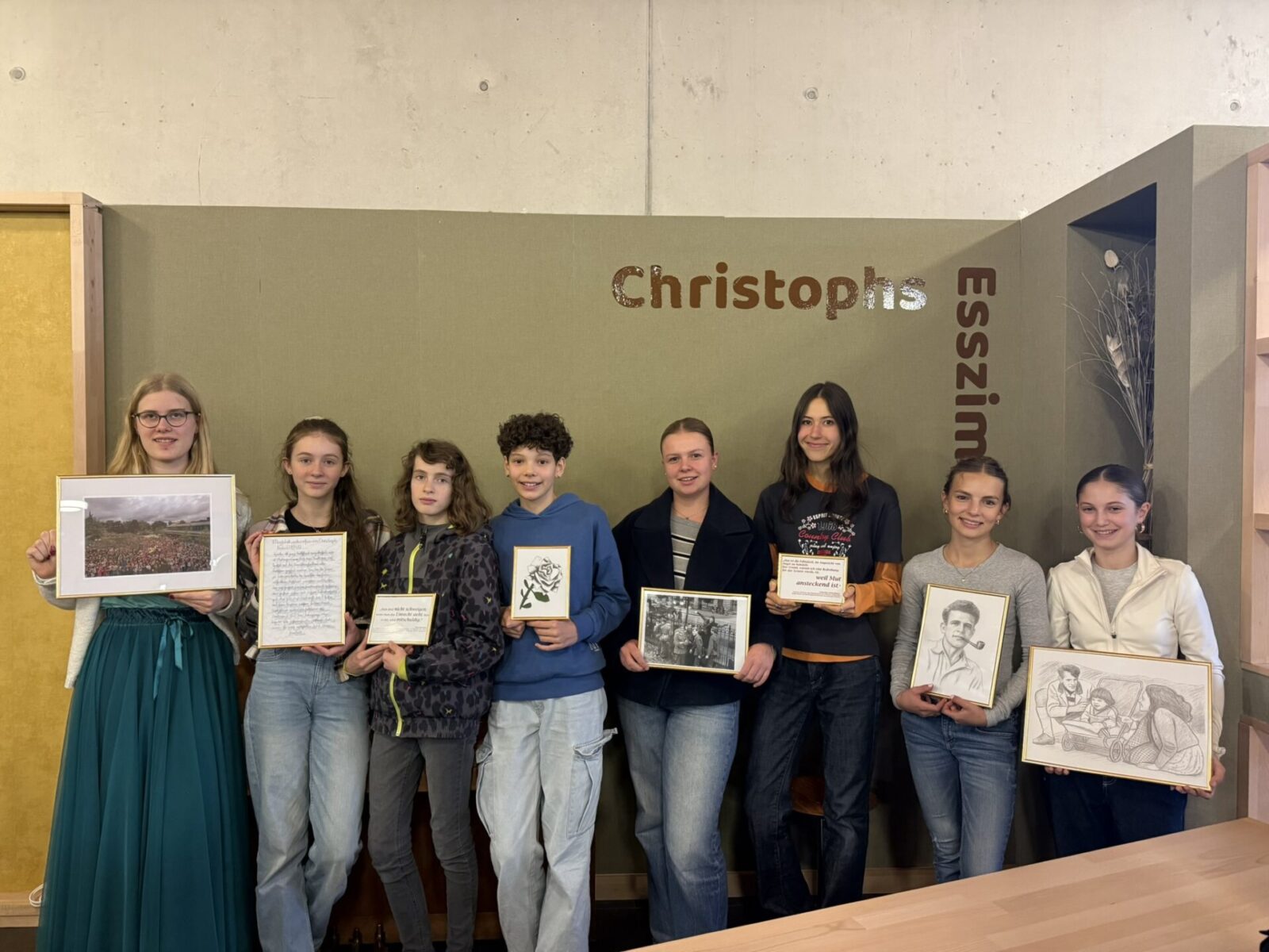 Die Gestaltung unserer Mensa ging nach den Herbstferien in die zweite Runde: Das Werteteam hatte die Ehre, „Christophs Esszimmer“ zu gestalten – eine spannende und verantwortungsvolle Aufgabe. Ziel war es, einen einladenden Raum für die Schulgemeinschaft zu schaffen, der persönliche Bilder und Gedanken zu Christoph Probst und seinen Werten präsentiert und eine Verbindung zwischen Vergangenheit und Gegenwart herstellt.