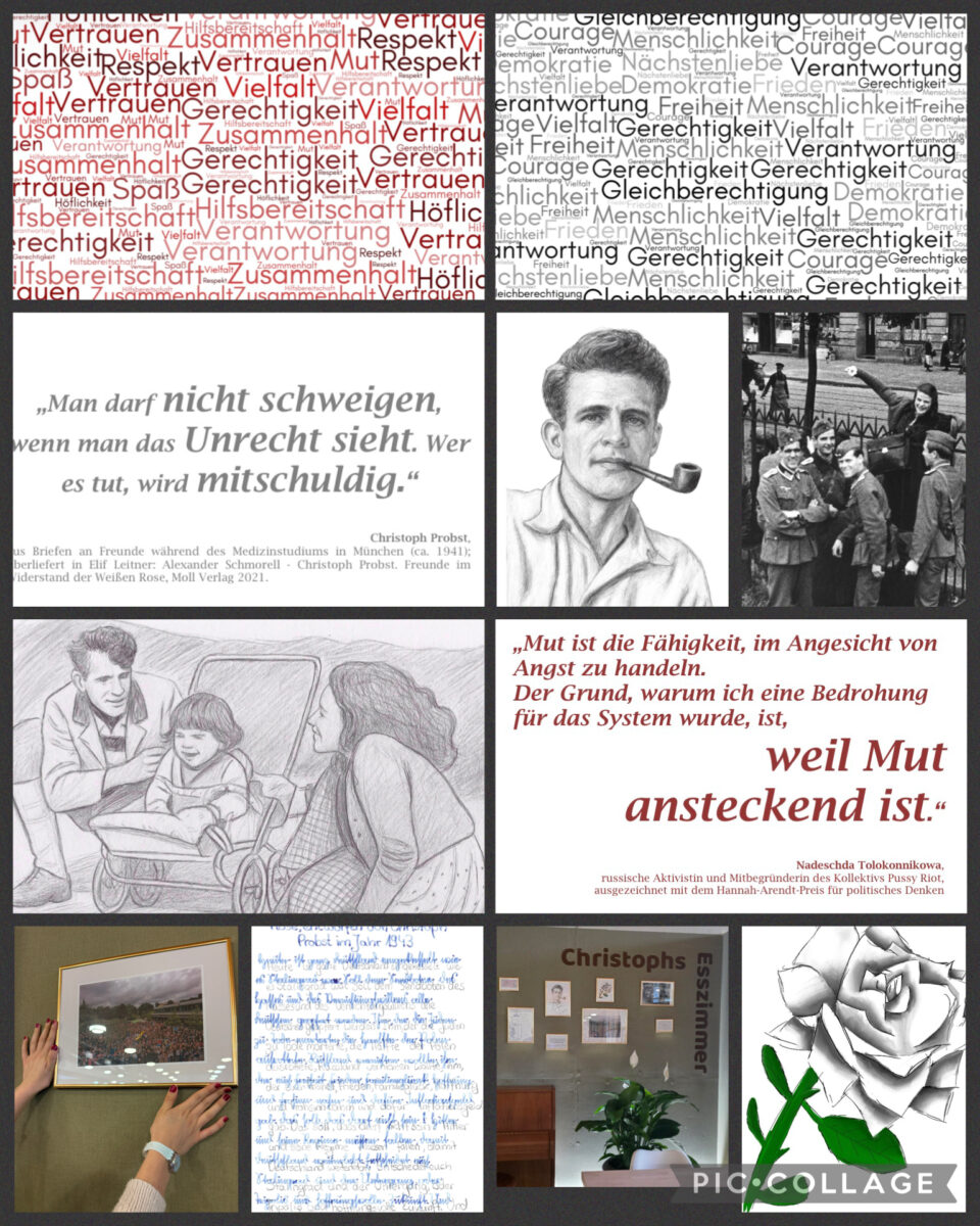 Rafaela Becker, 7c (Zeichnung der weißen Rose); Kiara Behring, 9c (Gestaltung des Flugblatts), Ronja Rostock, 8f (freie Zeichnung des Familienfotos); Milla Fahrnbach, 8f (freie Zeichnung des Portraits von Christoph Probst); Lina Fahrnbach, 11a (Recherche zu dem Foto der Mitglieder der weißen Rose); Juliane Behring, 7e und Emilina Lekies, 10d (Recherche und Auswahl der Zitate); Lenja Hummel, 11e ( Gestaltung der Wortwolken).