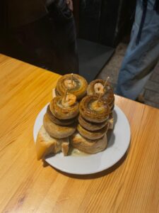 After that we continued our walk through the city and wachted the beautiful sunset. A few minutes later we arrived at the first tapas bar and tried „champis” for the first time. It’s a famous dish in Spain made out of bred,mushrooms and shrimp. In the second bar,just around the corner, we ate Patatas bravas which is like potatos with a special sauce. In the third and last bar we ordered croquetas con jamón.For desert we went to a famous frozen yogurt shop. All the dishes were very delicious.